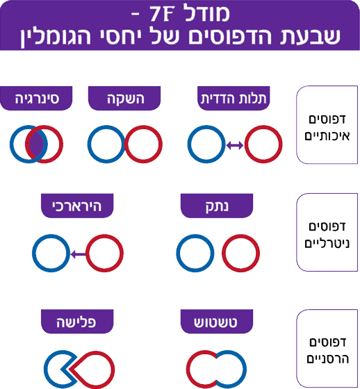 סינרגיה ארגונית מתבססת על מודל שבעת דפוסי יחסי הגומלין (F7 – 7 Forms of Interaction), מודל אשר מדגיש את קיומם של דפוסים החוזרים על עצמם בכל ארגון בין אם מדובר על תאגידים גדולים, חברות בינוניות, חברות הזנק, עסקים קטנים ועוד. בדרך הסינרגיה ניתן לצמצם דפוסים הרסניים ולחזק דפוסים מצמיחים ולייצר ארגונים שמחים ומצליחים.